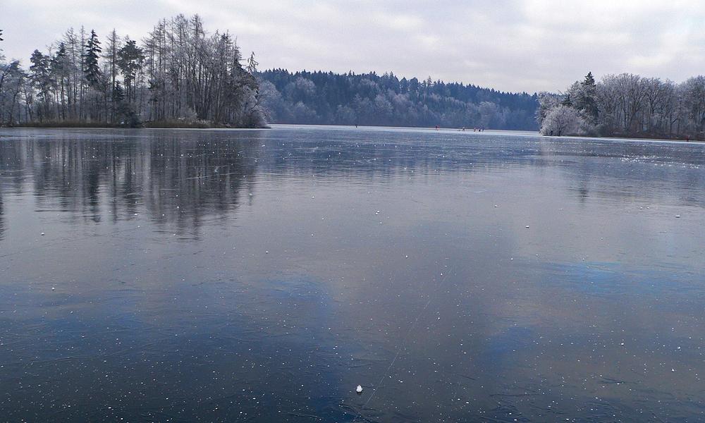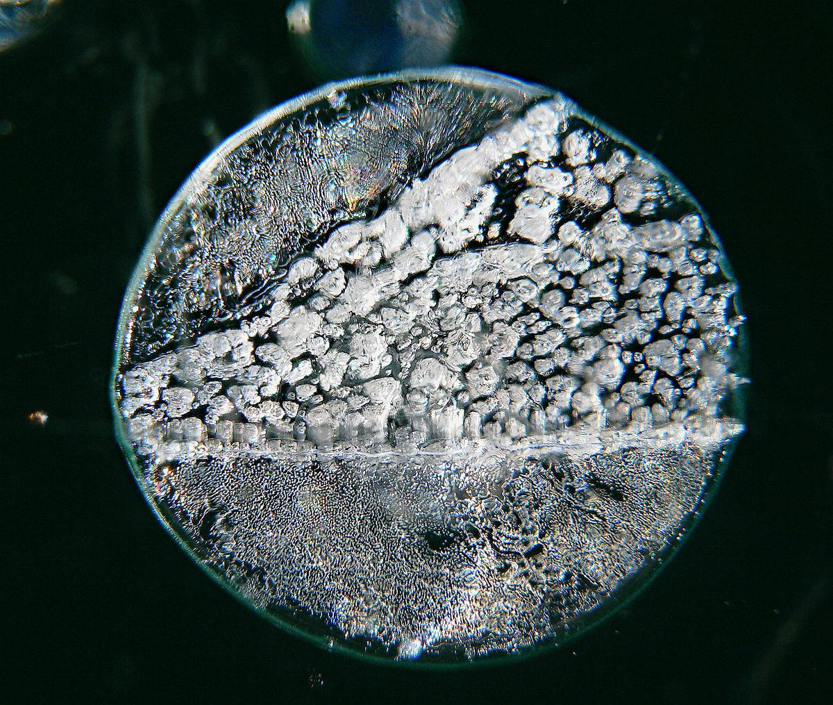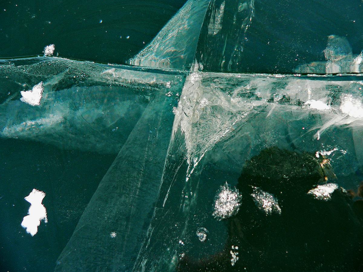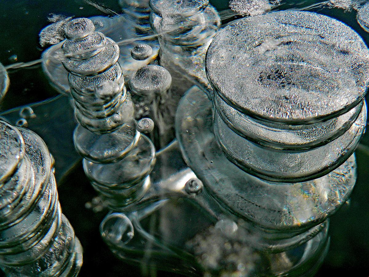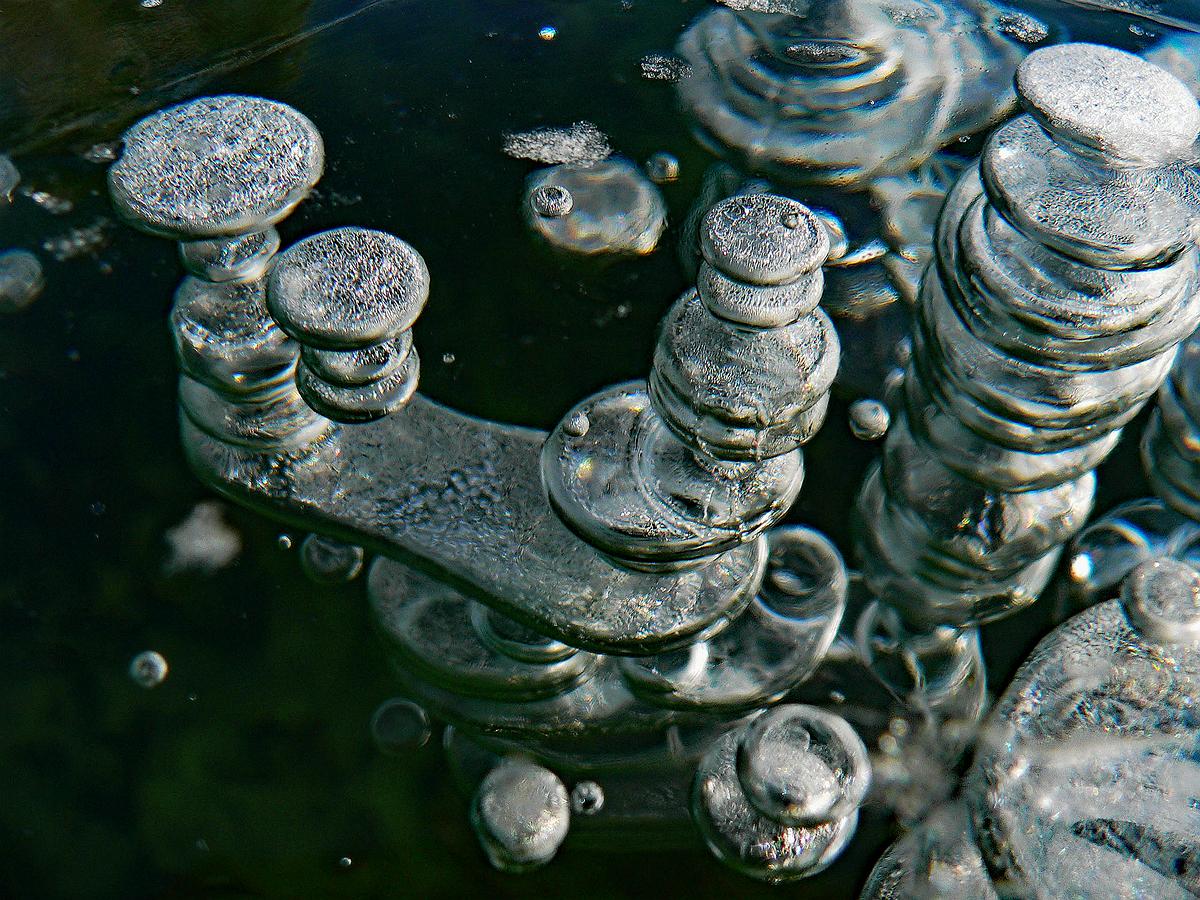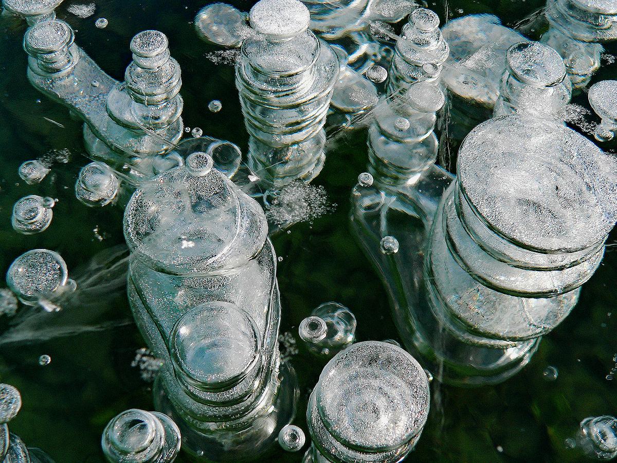 Gas bubbles in a frozen lake in close up.